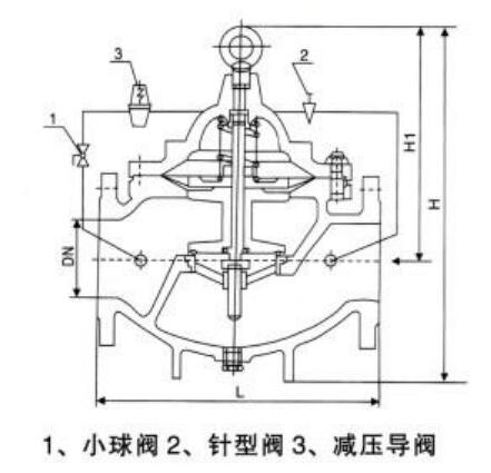 限流止回閥安裝于水泵出口,在單泵啟動(dòng)和非全數(shù)設(shè)計(jì)工作泵工作時(shí),對(duì)工作泵起限制流量作用,使泵在較高效率狀態(tài)下工作;防止電動(dòng)機(jī)在水泵低揚(yáng)程、大流量、低效率時(shí),發(fā)生過載現(xiàn)象;防止超額定電流燒電機(jī)現(xiàn)象的發(fā)生,同時(shí)起到一定的節(jié)能效果。其限流原理為:依據(jù)水泵的設(shè)計(jì)工況點(diǎn)揚(yáng)程,導(dǎo)閥自動(dòng)檢測(cè)并控制水泵的實(shí)際工作揚(yáng)程,以限制水泵的工作流量,限制電機(jī)的負(fù)載。
