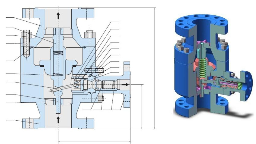 根據(jù)主流量不同,再循環(huán)閥的主閥閥瓣將被確定在某一個位置上,主路止回閥的閥桿通過一杠桿,將主閥瓣動作傳遞至旁路,旁路系統(tǒng)控制通過旁路的流量同時將壓力減至出口所需值,當(dāng)主閥瓣回到閥座關(guān)閉狀態(tài)時,所有流量通過旁路(回流),當(dāng)主閥瓣上升到頂端位置時,旁路則完全關(guān)閉,所有泵的流量流向工藝系統(tǒng)。