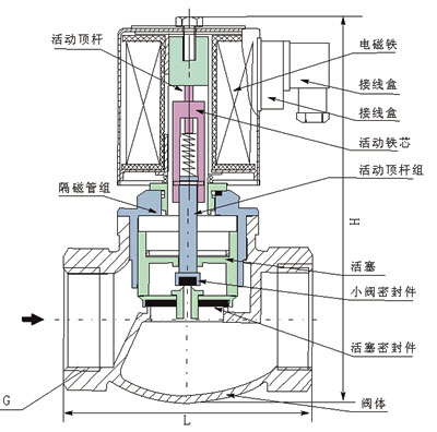 本閥為分步動(dòng)作直接先導(dǎo)式電磁閥,可根據(jù)斷電時(shí)所處開、關(guān)狀態(tài)的不同,可分為常閉式電磁閥和常開式電磁閥。常閉電磁閥,線圈通電后,銜鐵在電磁力作用下先帶動(dòng)副閥閥塞提起,主閥閥杯上的流體經(jīng)副閥流走,減少了作用在主閥閥杯上的壓力,當(dāng)主閥閥杯上的壓力減少到一定值時(shí),銜鐵帶動(dòng)主閥閥杯,并利用壓差而使主閥閥杯開啟,介質(zhì)流通。線圈斷電后,電磁力消失,銜鐵因自重下落復(fù)位。同時(shí)依靠介質(zhì)壓力,主副閥得以緊密關(guān)閉。常開電磁閥,線圈通電后由于吸力作用,動(dòng)鐵芯下移,把副閥閥塞壓下,副閥關(guān)閉,主閥閥杯內(nèi)壓力上升,當(dāng)壓力升到一定值時(shí),主閥閥杯的上下壓差一樣,由于電磁力作用,動(dòng)鐵芯失去主閥閥杯下,壓緊主閥閥座,閥門關(guān)閉。線圈斷電時(shí),電磁吸力為零,副閥閥塞和支鐵芯由于彈簧作用向上提起,副閥打開,主閥閥杯上的流體經(jīng)副閥流走,減少了作用在主閥閥杯上的壓力,當(dāng)主閥閥杯上的壓力減少到一定值時(shí),利用壓差把主閥閥杯推起,主閥打開,介質(zhì)流通。