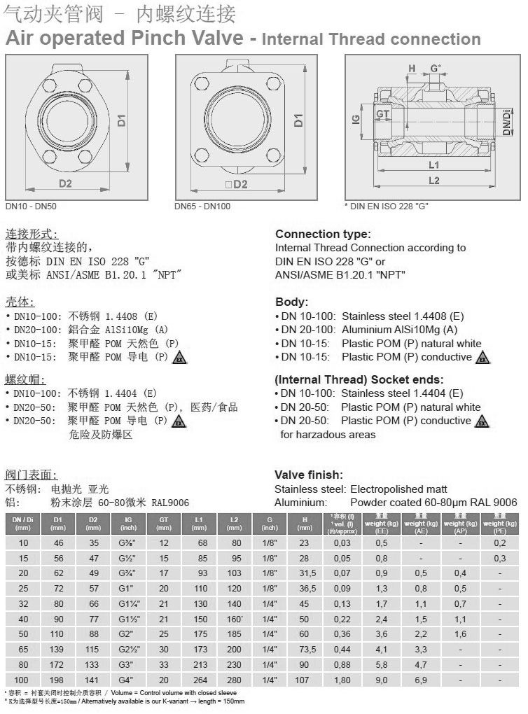 該款氣動(dòng)夾管閥只有內(nèi)襯套和兩個(gè)套管位于介質(zhì)流中(和工作介質(zhì)相接觸)。