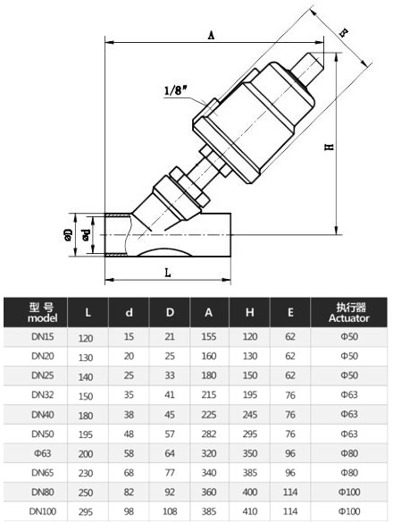 氣動焊接式角座閥工作原理:在非工作狀態(tài)時,由于彈簧力作用,閥門常閉(開)。當執(zhí)行器活塞被壓縮氣體作用時,閥門打開(關閉)。雙作用形式靠壓縮氣體控制閥門開關。