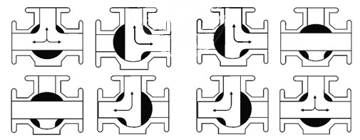 三通球閥可分為L形和T形,L形(Q44F/Q44H)三通球閥用于介質流向的切換,能使相互垂直的兩個通道連接;T形(Q45F/Q45H)三通球閥用于介質分流、合流及流向切換。T形三通可以使三個通道相互連通或使其中的兩個通道連通。