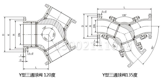 | 135度Y型三通球閥尺寸圖 | |||||||