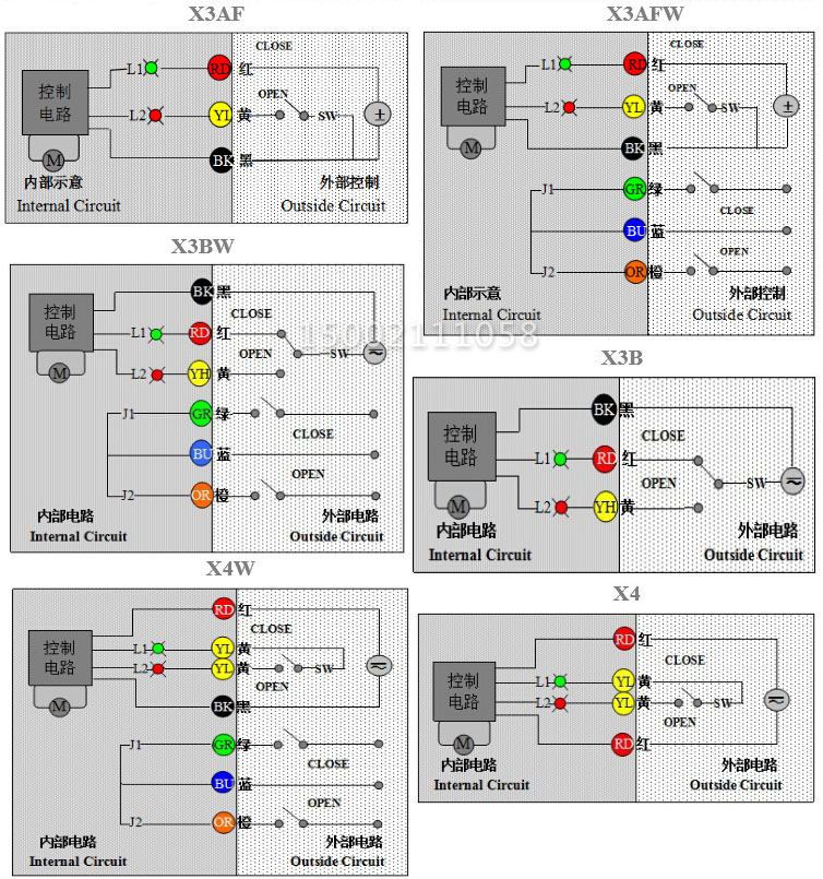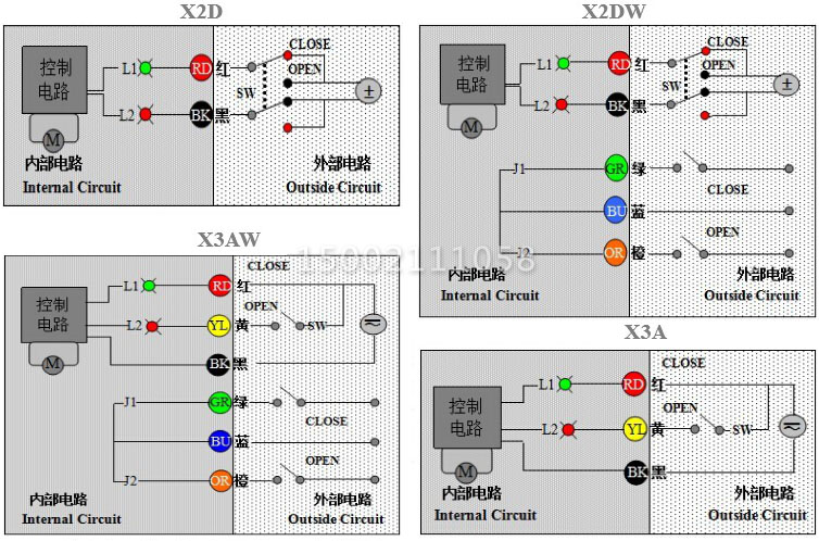 2、X2DW(直流二線-控帶信號反饋)一接線原理:這 款為直流電源,包括DC6、12、18、24V 等電壓可選, 控制線為紅、黑色,SW和OPEN相連閥門開啟,到 位后并保持,同時紅色指示燈亮起及執(zhí)行器給出到位 無源反饋信號。SW和CLOSE連接閥|門關閉,到位 后并保持,同時綠色指示燈亮起執(zhí)行器給出到位無源 反饋信號。直流:紅線接正,黑線接負。