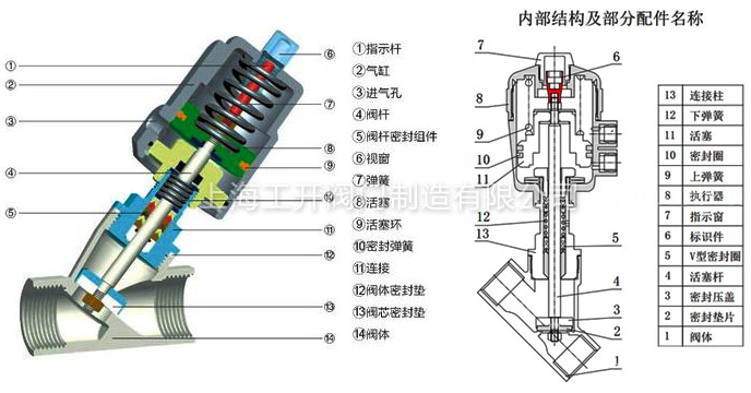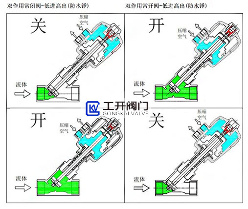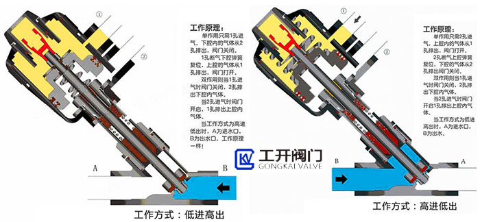 當(dāng)壓縮空氣進(jìn)入氣缸內(nèi)從下向上推動(dòng)活塞運(yùn)動(dòng),使閥門(mén)開(kāi)啟;反之壓縮空氣從上向下推動(dòng)活塞運(yùn)動(dòng),使閥門(mén)關(guān)閉。
