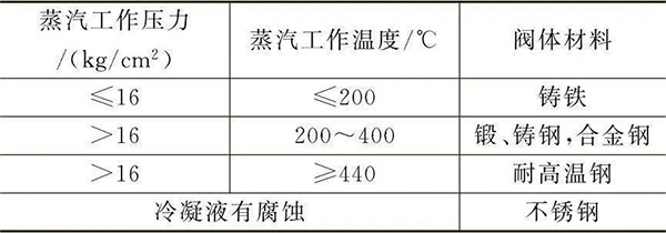 2、閥體的材料選擇在不同的使用條件下,應(yīng)選擇不同的閥體材料,主要是以蒸汽的壓力和溫度來選取閥體材質(zhì)(表)。