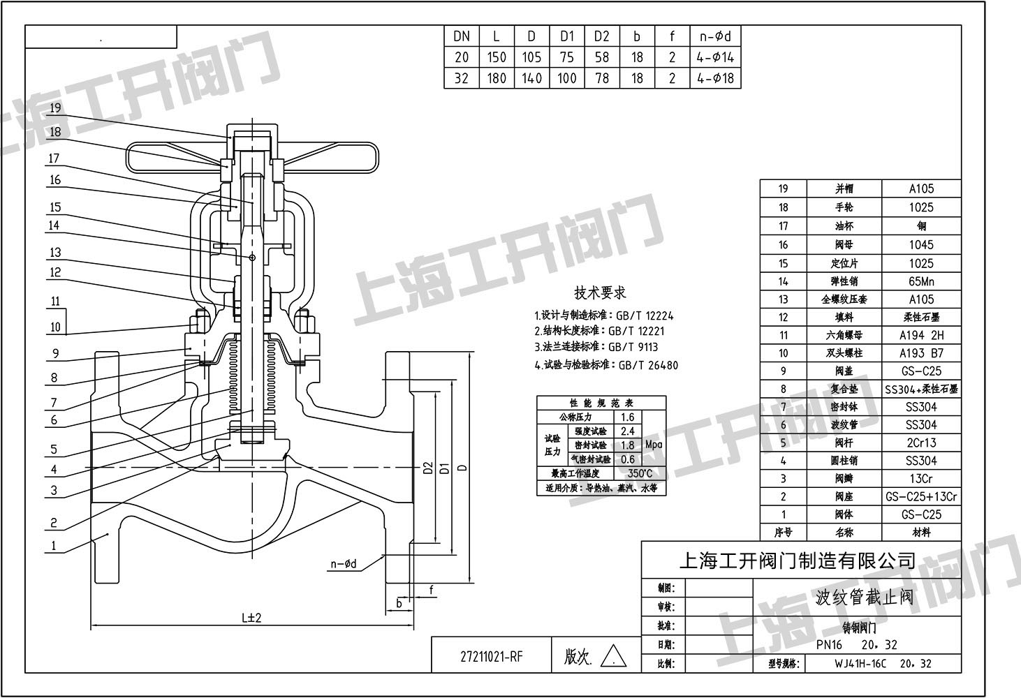 WJ41H-16C DN20 DN32鑄鋼波紋管截止閥圖紙