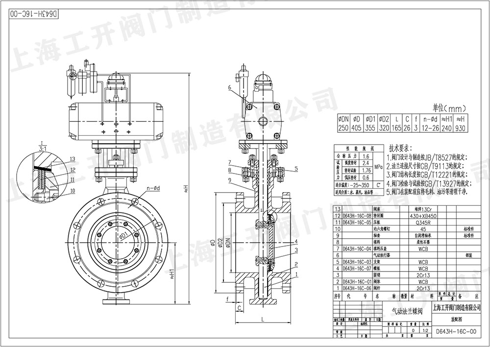 氣動蝶閥D643H-16C-DN250蝶閥圖紙