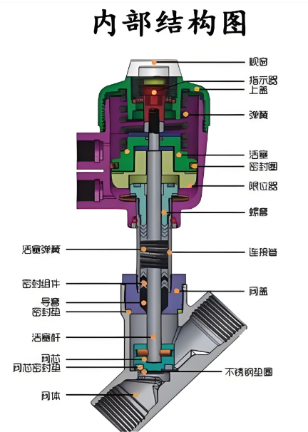 氣動(dòng)角座閥主要由執(zhí)行機(jī)構(gòu)、控制單元、連接件和密封件等部分組成。其中執(zhí)行機(jī)構(gòu)包括活塞、彈簧和連桿等部分。