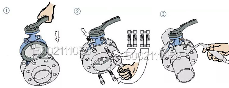 1、將蝶閥放置于預(yù)安裝的兩片法蘭之間,注意螺栓孔要整齊對齊
