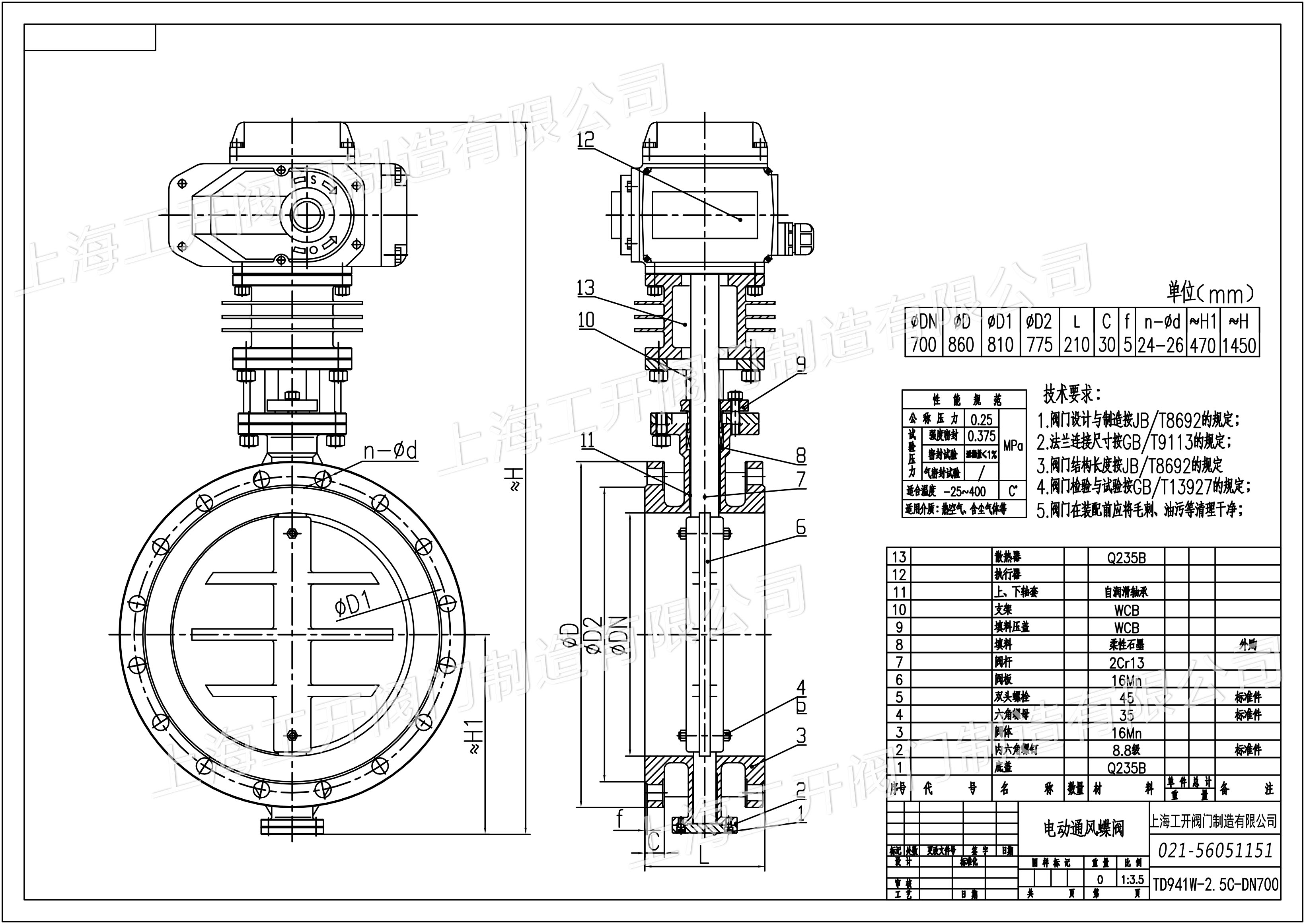 閥門圖紙-電動蝶閥TD941W-2.5C-DN700結(jié)構(gòu)尺寸圖
