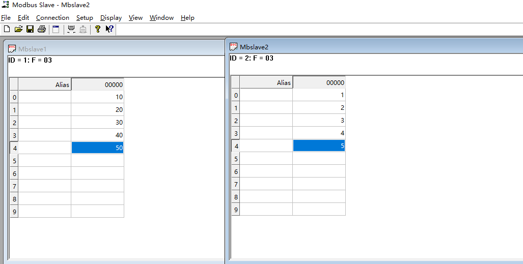 然后設(shè)置寄存器,以及寄存器的值。演示案例設(shè)置了0-4 、5個(gè)寄存器,值分別設(shè)置為 10-50,如下圖所示: