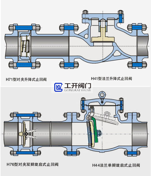 止回閥主要作用是防止介質(zhì)倒流,保護(hù)管線及泵的安全,屬于自動(dòng)類閥門(mén)。止回閥的種類很多,其中,旋啟式止回閥和升降式止回閥是兩種常見(jiàn)的止回閥類型,升降式止回閥型號(hào)主要有法蘭式H41和對(duì)夾式H71,旋啟式止回閥型號(hào)主要有法蘭式H44和對(duì)夾式H76。上海工開(kāi)閥門(mén)下面為大家具體說(shuō)一說(shuō)這兩張止回閥的區(qū)別,以便大家更好的選用。