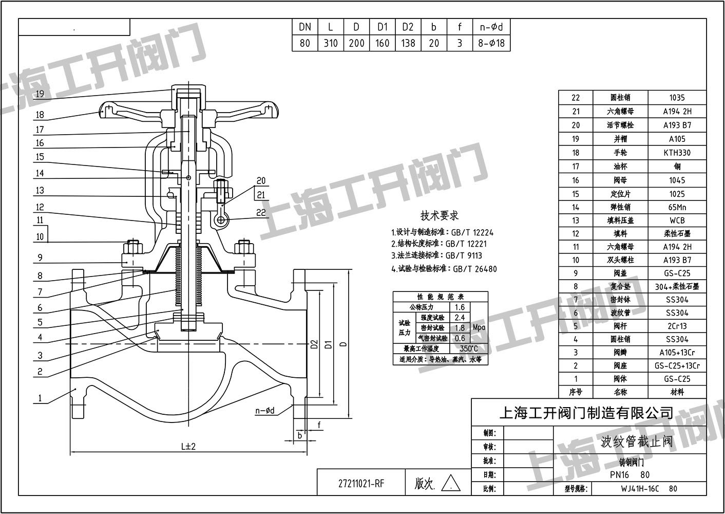 波紋管截止閥-WJ41H-16C-DN80圖紙